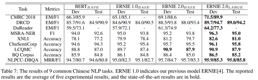 [11]ERNIE2.0: A Continual Pre-training Framework for Language Understanding: https://pdfs.semanticscholar.org/9025/1aa6225fcd5687542eab5819db18afb6a20f.pdf?_ga=2.6153395.1282941031.1565490089-793294112.1556434811