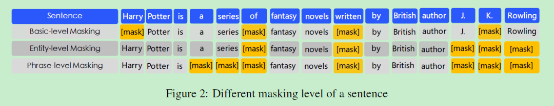 那么怎么样才能使得模型学习到文本中蕴含的潜在知识呢?不是直接将知识向量直接丢进模型,而是在训练时将短语、实体等先验知识进行mask,强迫模型对其进行建模,学习它们的语义表示。具体来说, ERNIE采用三种masking策略: