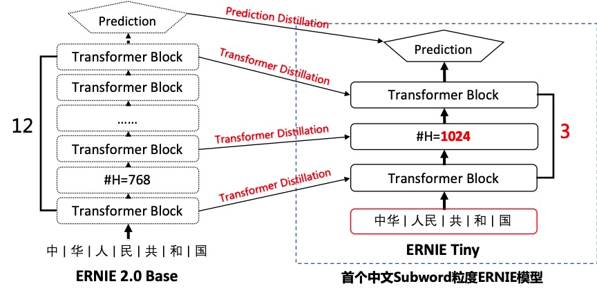 为了进一步提升模型的效果,ERNIE Tiny扮演学生角色,利用模型蒸馏的方式在Transformer层和Prediction层去学习教师模型ERNIE模型对应层的分布或输出,这种方式能够缩近ERNIE Tiny和ERNIE的效果差异。