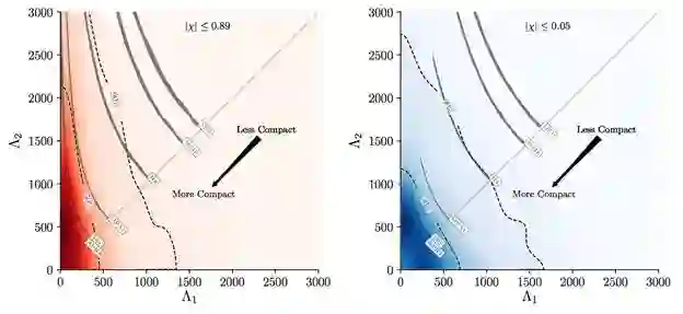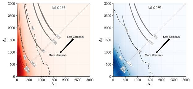 引力波信号对中子星形变系数的限制。左图假定自旋的上限是极端黑洞的自旋,而右图采用中子星自旋上限。