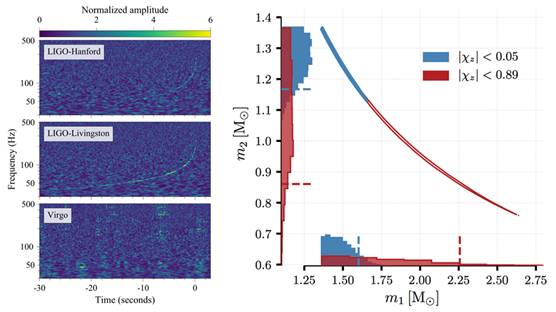 时间频率图上的双中子星碰撞引力波信号(左图),以及引力波对两个中子星质量的测量(右图)