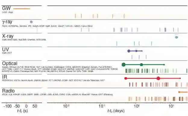 在后续的几个星期里,天文学家们利用其他位于地面、空间和地下的天文观测站,在电磁波的各个波段 (从伽马射线、X光、紫外,红外,可见光,微波),以及利用中微子探测技术,对这个已经由三个独立运行的引力波观测站 (LIGO Hanford, LIGO Livingston和Virgo)、伽马射线,和可见光都探测到的天文事件进行了进一步详细的研究。