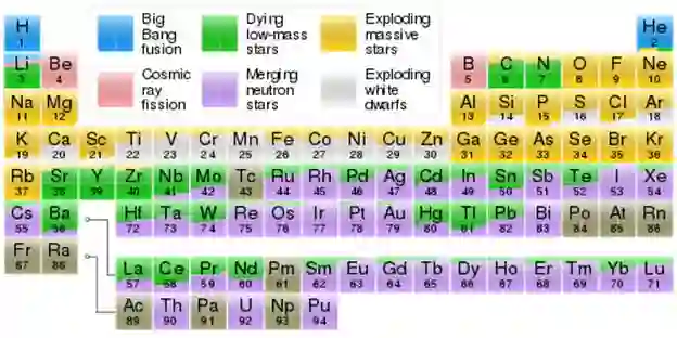 宇宙中元素的起源:紫色的元素在理论上认为是由中子星碰撞产生的。(Wikipedia)