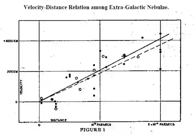 1929 年,美国天文学家哈勃通过观测发现,离地球较远的星系,就会以更快的速度远离地球。远离的速度(也就是“退行速度”)大致和星系和地球的距离成正比。我们可以想象,在一个膨胀的气球上的相邻点,也是距离越远,相对速度越大。于是,哈勃的观测结果,意味着宇宙在膨胀中,这就开启了宇宙学的新时代。粗略的说,哈勃利用了一种变星已知的发光强度,跟在地球上接收到的光强比对,来测量星系到地球的距离。而星系相对于我们的速度,哈勃是利用星系的发射光谱相对于地球上同样元素的光谱往波长更长方向的多普勒移动测出。