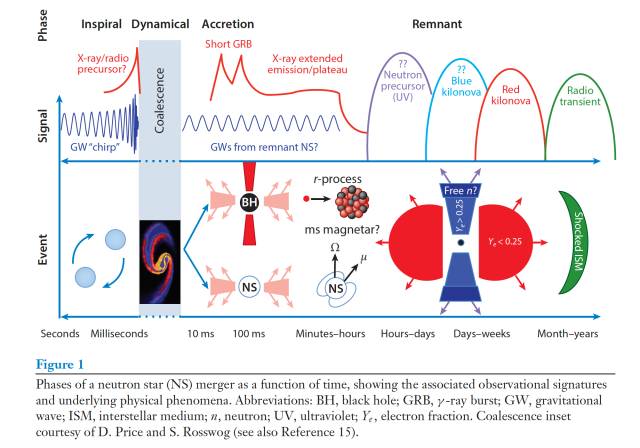 具体的说,两个中子星并合之后,理论预言有三个可能演化途径,一个是直接变成了黑洞,另外一个是因为旋转能等作用,会有一个磁性中子星存活一段时间(小于约100毫秒),然后再变成了黑洞,还有一个可能是并合后的中子星质量比小,中子星一直存在。无论如果,这个碰撞过程会抛射出物质,大家也相信中间核心天体周围形成一个吸积盘。这些抛出的物质发生r-过程(产生了我们需要的金子!),这些物质还和周围星际介质发生相互作用产生。当然,天文学家看到是短伽马射线暴和千新星等现象。