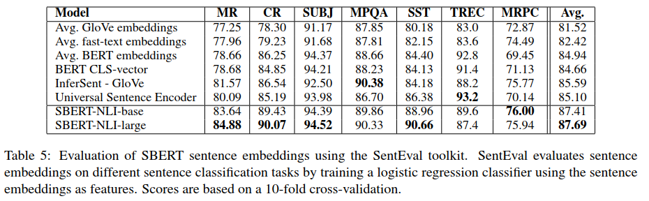 SentEval是一个当前流行的用来评测句子embedding质量的工具,这里句子embedding可以作为逻辑回归模型的特征,从而构建一个分类器,并在test集上计算其精度。这里利用SentEval工具在下面几个迁移任务上对比SBERT与其它生成句子embedding的方法: