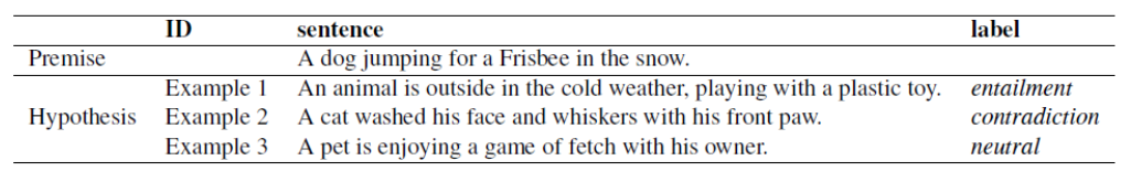 文中训练结合了SNLI(Stanford Natural Language Inference)和Multi-Genre NLI两种数据集。SNLI有570,000个人工标注的句子对,标签分为矛盾、蕴含、中立三种;MultiNLI是SNLI的升级版,格式和标签都一样,有430,000个句子对,主要是一系列口语和书面语文本。文本蕴含关系描述的是两个文本之间的推理关系,其中一个文本作为前提(premise),另一个文本作为假设(hypothesis),如果根据前提P能够推理得出假设H,那么就说P蕴含H,记做P->H。参考样例如下: