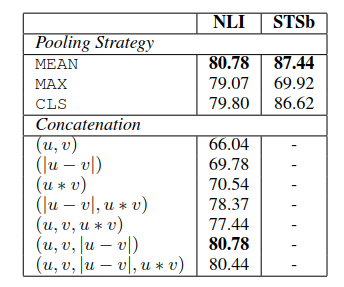 在pooling策略上,MEAN效果最好;在向量组合模式上,只有在分类训练的时候才使用,结果显示element-wise的|u-v|影响最大。