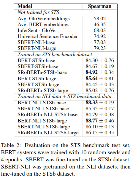 Trained on STS benchmark :表示没有使用NLI数据集,直接在STSb训练数据集上利用孪生网络结构构建回归模型fine-tuning;
