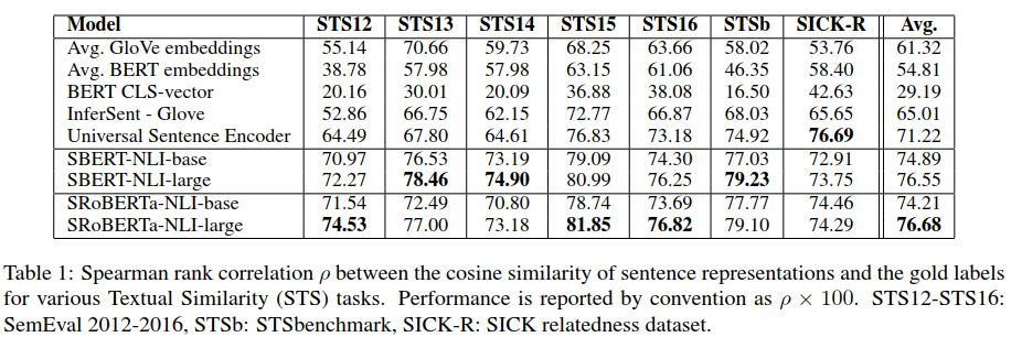 Trained on NLI data+STS benchmark :表示利用孪生网络先在NLI数据集上训练分类模型学习句子向量表示,然后在STSb训练集上再利用回归模型再次学习句子embedding,相当于利用两种数据集进行了两次fine-tuning。