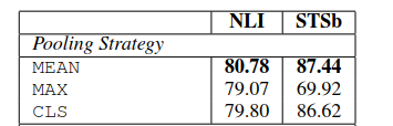 SBERT在BERT/RoBERTa的输出结果上增加了一个pooling操作,从而生成一个固定大小的句子embedding向量。实验中采取了三种pooling策略做对比: