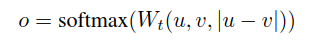这里将embedding向量u和v以及它们之间的差向量拼接在一起,组成一个新的向量,乘以权重参数Wt∈R3n*k,n表示向量的维度,k是分类标签数量。