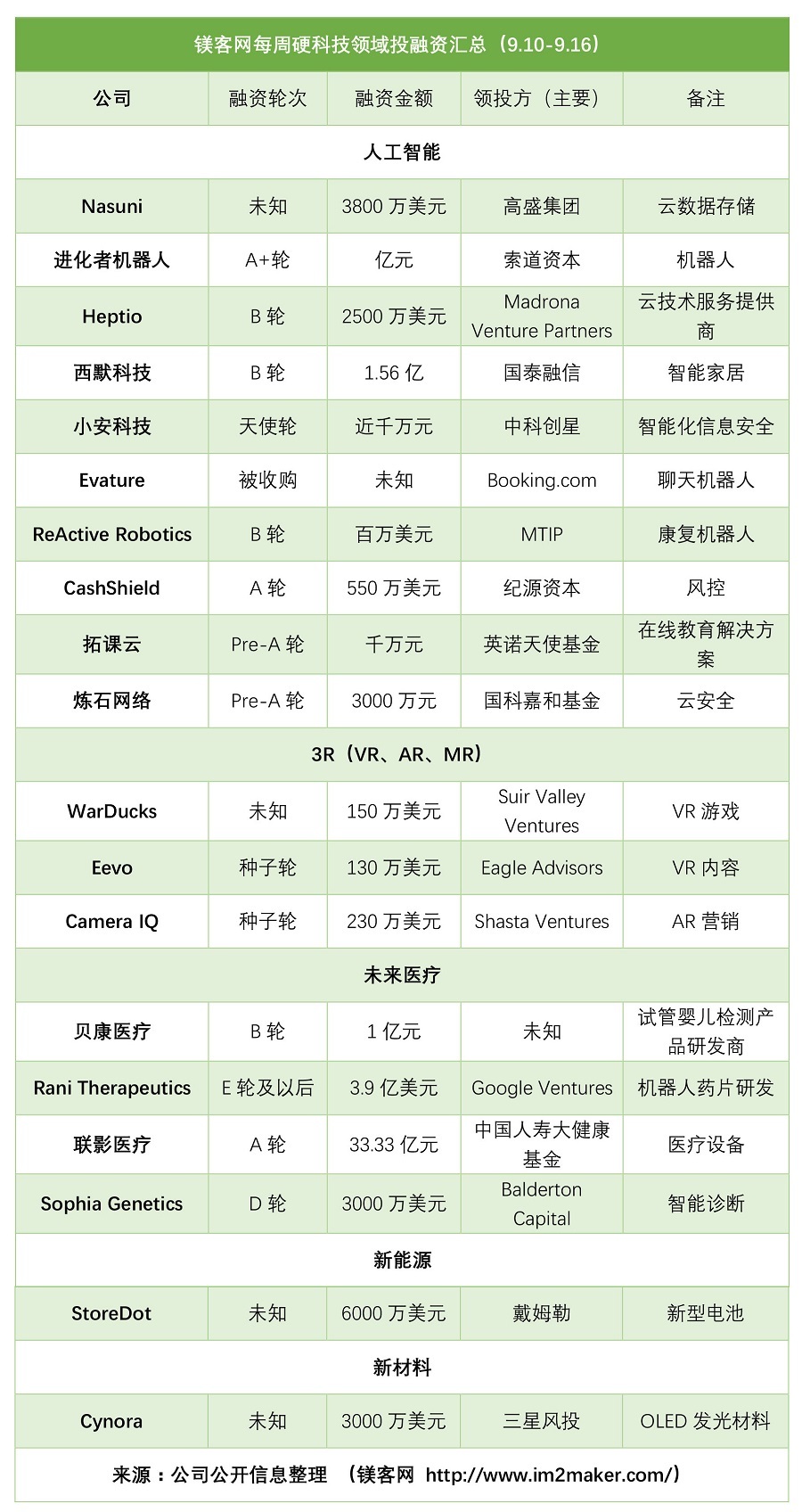 本周(9.10-9.16)硬科技领域内合计公开报道了19起相关的投融资事件,其中还包括人工智能领域内的1起收购,相比较前几周,数量有所下降。