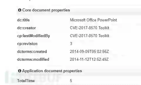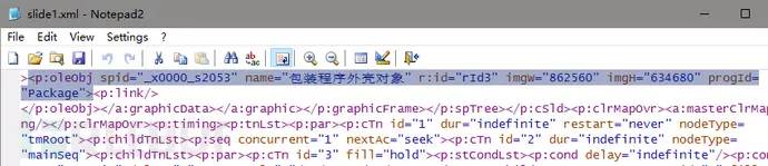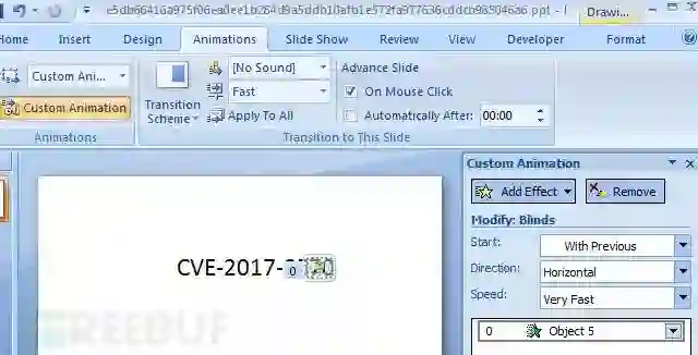 由于RTF版本的漏洞利用大量使用,各家安全软件检出率也都比较高,攻击者开始转向另外一种office文档格式进行攻击,攻击者发现ppsx格式的幻灯片文档也可以无交互触发漏洞,该利用方式的原理是利用幻灯片的动画事件,当幻灯片的一些预定义事件触发时可以自动触发导致漏洞利用。