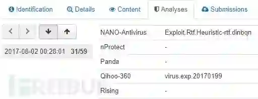 我们可以看到在野利用的RTF样本在VT上的检出率为31/59。