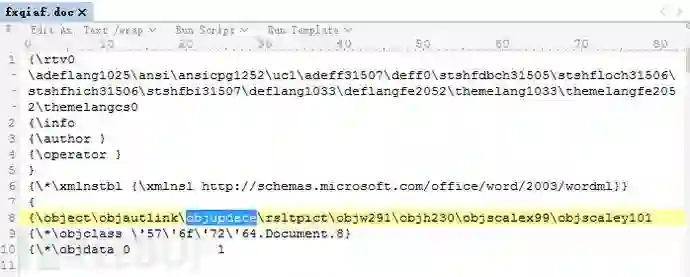 CVE-2017-0199漏洞在第一次被公开时,野外最早利用的样本是以word文档的形成进行传播利用,由于office文档后缀关联的宽松解析特性,更改其他文档后缀名,攻击仍然可以成功,所以野外利用的大部分恶意文档的真实文件格式是RTF格式,但恶意文档的后缀名却是 doc 、docx等后缀,该攻击具有较强的伪装欺骗特性。在野外利用样本文件格式中有一个关键字段objupdate,这个字段的作用是自动更新对象,当受害者打开office文档时就会加载远程URL的对象,对远程服务器触发一个HTTP请求,恶意服务器会对针对客户端的http请求强制返回Content-type为application/hta响应,最终客户端office进程会将远程的文件下载当作hta脚本运行,整个攻击过程稳定且不需要受害者的任何交互操作。