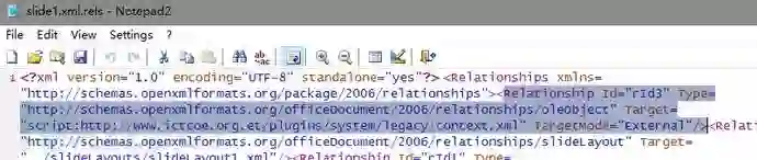当受害者打开恶意幻灯片文档时就会自动加载远程URL的对象,对远程服务器发起一个HTTP请求将文件下载到本地,最终客户端office进程会将下载到本地的文件当作sct脚本执行。