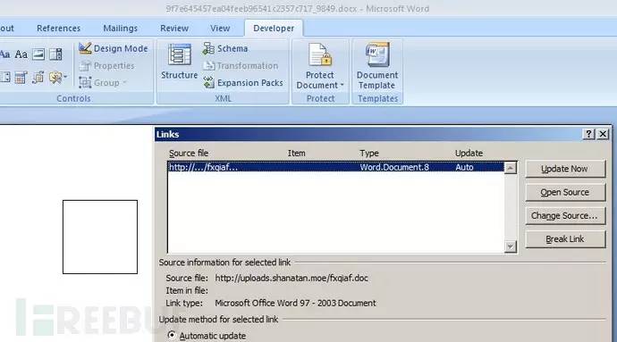 如下图,我们会发现docx格式的文档嵌入了一个远程的文档对象: