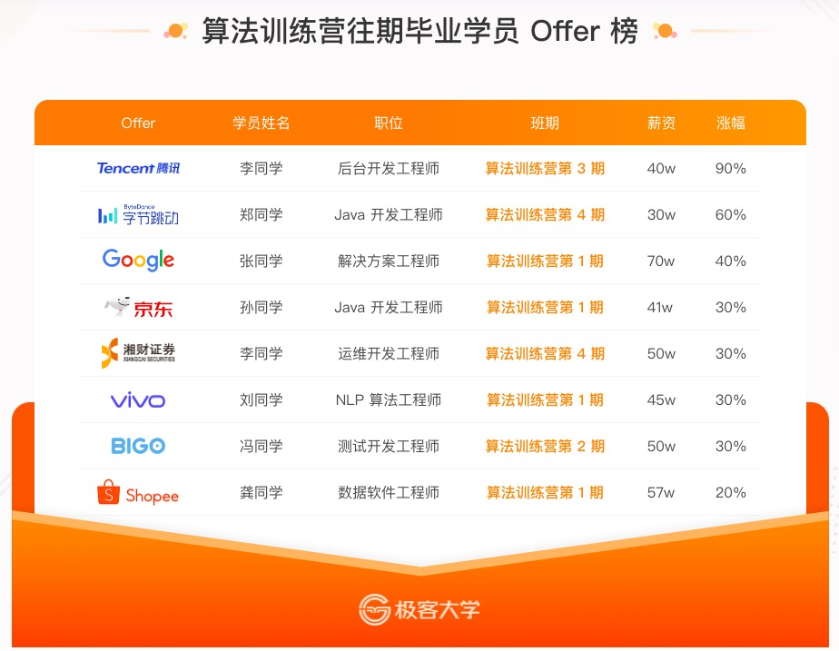 算法训练营已经开到第 11 期,已经有 2000+ 技术人参加学习,已经毕业的学员中,很多都拿到了 Google、阿里、腾讯、头条、美团等等一线大厂的 Offer,薪资涨幅普遍在 30-40%,有的学员甚至可以达到 90%。