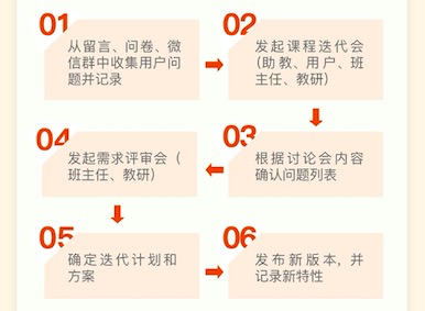 每期训练营全部结束后,班主任会再次发起问卷,并邀请助教、学员代表,与极客大学的教研组、学习服务组共同进行迭代评审会,针对前期收集的用户反馈逐一讨论,确定接下来的迭代方向。具体流程如下: