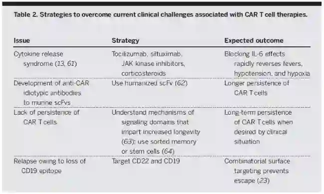 大多数复发性白血病患者在CD19特异性CAR-T细胞治疗后获得完全缓解。但出现了两种形式的抗性。在急性白血病患者中,CD19抗原表位的缺失是肿瘤逃逸的主要机制。在针对青少年和小儿急性白血病患者的临床试验中,CD19表达阴性的患者复发率为28%。在慢性淋巴性白血病(CLL)中,尚无报道发现CD19缺失产生耐药,CLL的耐药性可能是由于细胞输注后CAR-T细胞不能增殖。表2列出了CAR-T细胞疗法在临床治疗中需要克服的几个重要挑战。