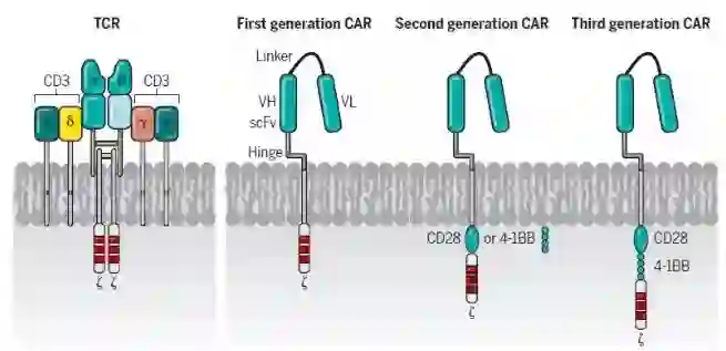 相比之下,CAR结合了抗原结合结构域(最常见的是由抗体可变结构域衍生的单链可变片段(scFv)),TCRç链的信号结构域,以及受体(如CD28,OX40和CD137)的共刺激结构域。CAR克服了工程化TCR的某些局限性,例如需要MHC表达,MHC特性和共刺激信号。由Kuwana和Eshhar领导的小组首次表明了,这些类型的合成受体分子能够使T细胞识别MHC非依赖性靶标。与MHC限制无关的CAR识别,使CAR-T细胞具有显著的抗肿瘤优势,因为肿瘤免疫逃逸的主要机制之一就是肿瘤细胞MHC相关抗原提呈的丢失。目前CAR-T细胞的一个局限性是它们需要靶向肿瘤细胞表面上的抗原。