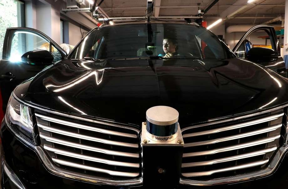 图 6 今年 7 月,在位于加州帕洛阿尔托的福特研究和创新中心,实习生 Austin Peak 坐在一辆前端装有 Velodyne 公司生产的激光雷达传感器的测试车内