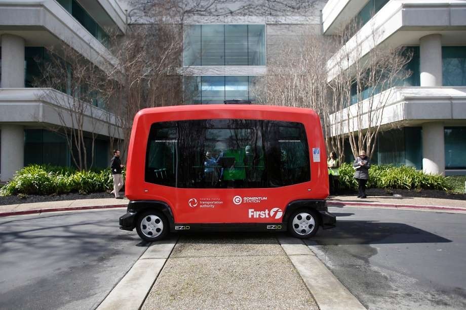 班车以 7 英里每小时的平稳速度穿行在加州大学圣克拉拉分校两边栽满棕榈树的人行道间,每当有人从前面穿过人行道时,车子震动一下就停了。埃里克·韦伯(Eric Weber)是这辆车的备用司机,当汽车在校园建筑之间缓缓穿梭、到站停靠、掉头继续在校园内行驶时,他向荣格展示自己并未用手操控汽车。这辆车会绕过不注意看路的滑板玩家、成群结队的学生和参观校园的游客,其中有些人会掏出手机给车子拍照。
