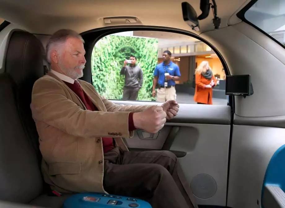 图 10 史蒂夫·马汉(Steve Mahan)是位盲人,坐在Waymo无人驾驶车内,假装握着方向盘