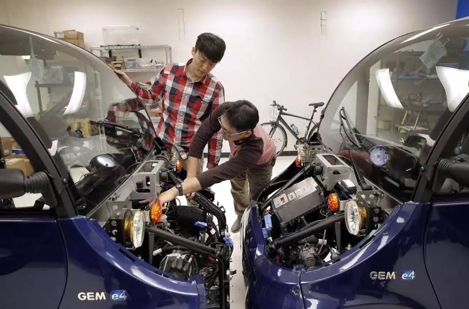 图 12 今年 3 月,Auro Robotics 公司的工程师王大卫(David Wong,右)和实习生翟蒙(Di Meng)在研究无人驾驶班车。该公司在加州圣克拉拉大学投放运营这种车辆