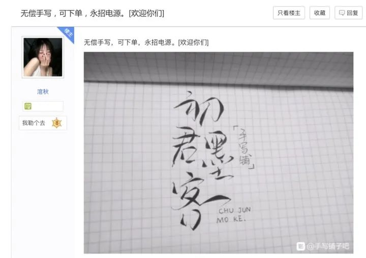 顾客会回帖下单自己想要写的字,然后我用笨拙稚嫩的字体在纸上抄写一遍,最后再用电脑摄像头拍下来回传给顾客。