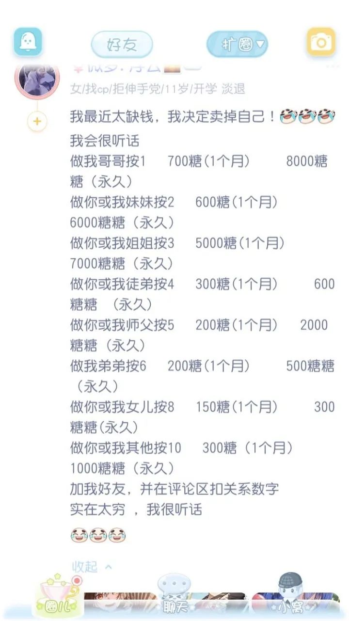 如果你在小肚皮动态广场看到“我最近太缺钱,决定卖掉自己”这样的话,不要着急感叹世风日下,他们只是想扩列而已。