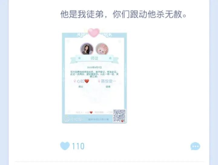 我欣然接受了她的邀请,我的师傅立刻给我发来了520的肚皮糖,并且发动态官宣了我:这是我的徒弟,你们敢动的话,杀无赦。