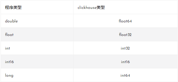 如上问题是由于clickhouse中数据类型为float32,程序中的类型为double就会引起上述问题,附上部分数据类型对应关系: