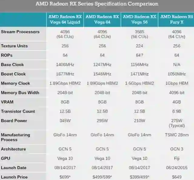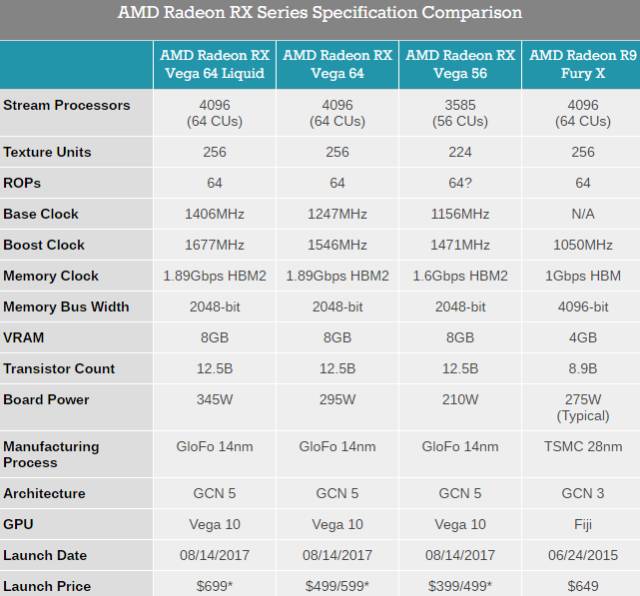 AMD推出四款RX Vega系列显卡,包括399美元Radeon RX Vega 56公版和499美元的Vega 64标准公版,这四款显卡于8月14日开始发售。其性能配置如图所示: