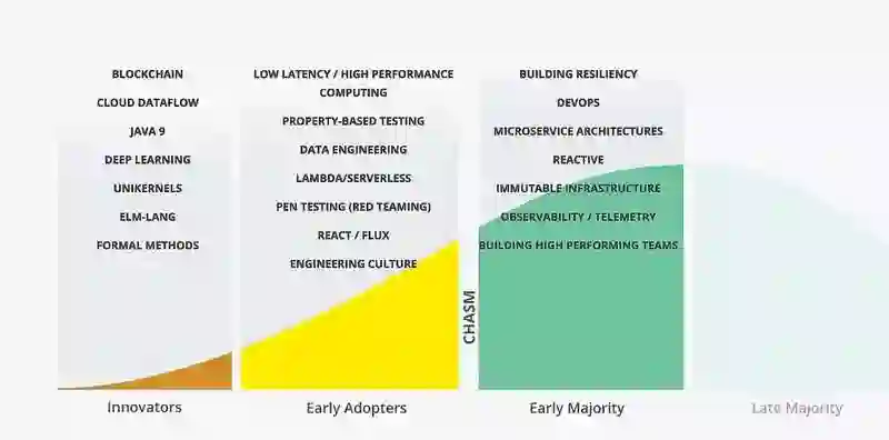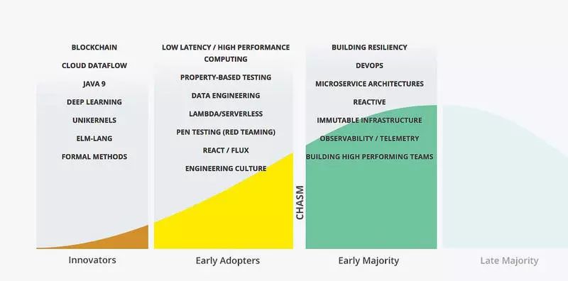 每一个新技术被采用的过程可以分成五个阶段,分别包括创新者、早期采用者、早期大众、晚期大众、与落后者。除了狂热的创新者,了解学习一个新技术最佳的时期是在第二个阶段,这时候技术的应用比较稳定,又有着广阔的拓展空间,但技术迭代迅速,展现纷呈,很难全面的了解每一项新技术的研发思路与发展未来。