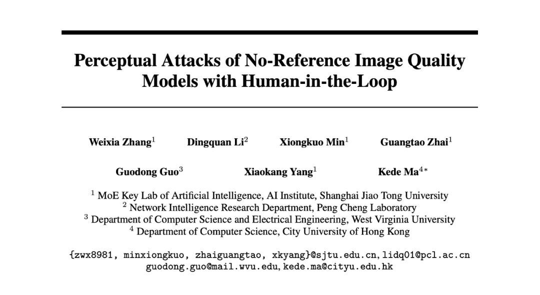 近日,上海交通大学人工智能研究院杨小康教授和张维夏博士等人在无参考图像质量评价的研究成果“Perceptual Attacks of No-reference Image Quality Models with Human-in-the-Loop”被国际机器学习和人工智能顶级会议 NeurIPS 2022 接收。论文提出了一种人在环路的感知攻击算法,为无参考图像质量评价的视觉感知鲁棒性研究奠定了基础,有望推动智能时代的图像视觉质量保障体系发展。