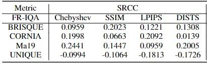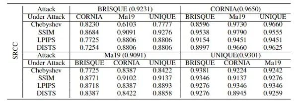 在感知鲁棒性评估方面,我们采用斯皮尔曼秩相关系数(SRCC)进行衡量,SRCC的值越高,代表NR-IQA模型的抵御对抗攻击的性能更佳,即鲁棒性更好。