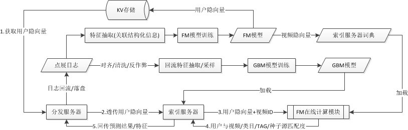 由于FM需要例行训练,用户隐向量灌库和视频隐向量加载之间存在时间差,而不同版本模型的隐向量之间是不可比的。为此我们设计了简单的版本对齐机制:所有隐向量都会保留最近2个版本的数据;在FM在线计算模块中,实现版本对齐的逻辑,用对齐后最新版本的隐向量计算匹配度。由于例行训练的时间窗口为4~6个小时,保留2个版本的数据是足以保证绝大部分隐向量能够对齐。在更加高频的模型训练中,可以增加版本的数量来确保模型对齐。