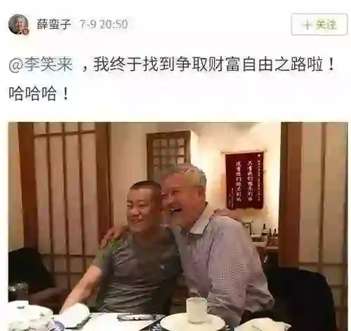 不过,李笑来毕竟是有强大影响力的天使投资人。天使就要和天使在一起。比如薛蛮子这个老天使,今年7月,薛就在微博上晒出跟李笑来的合影,两个天使很灿烂的样子,薛老天使还说:“我终于找到争取财富自由之路啦!”