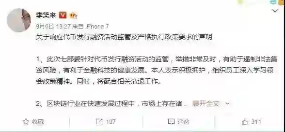 却又在央行联合七部委下发的《关于防范代币发行融资风险的公告》后,慌忙澄清并谄媚表态。