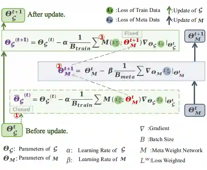 通过 nested meta learning 优化过程,我们将得到有助于本次训练的权重信息,使得在真正梯度下降并更参数的过程,是在学到有效的权重参数的指导下进行: