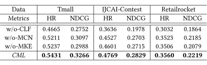 我们设计了 CML 的三种变体, 以证明 CML 关键部件的合理性与有效性。w/o-CLF 去掉了对比学习,只利用 GNN 捕捉多行为关系,而它的实验结果表明了 CML 的多行为对比学习的有效性和对比起到的知识迁移的效果;w/o-MCN 是为了探究行为偏好的影响,如果使得多行为对比有一样的权重,则实验结果表明 meta contrastive 网络可以自动区分 target-auxiliary 行为对之间的影响。