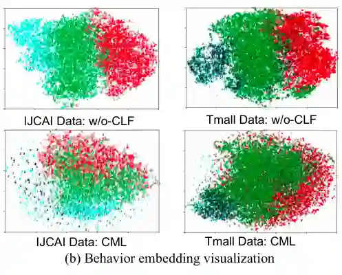 Embedding 可视化实验针对 CML 和 w/o-CLF,说明了 CML 在缓解数据稀缺问题方面的有效性并再次证明:多行为的 contrastive learning 框架的可以最大化行为间的互信息,引入自监督信号,进行跨不同类型行为的知识迁移。