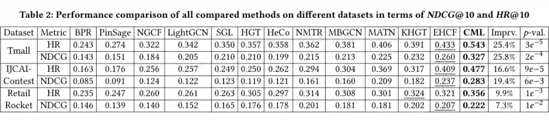 我们在三个真实的数据集(Tmall,IJCAI,RetailRocket)上,通过与 12 个属于不同子技术领域(普通推荐,自监督,多行为推荐)的模型做了比较。结果表明我们的 CML 优于各个 baseline。