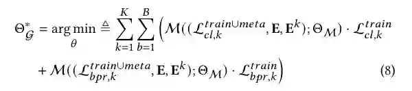 随后模型会将提取出来的 meta knowledge 送入基于元学习的权重网络(meta weight network)中,从而学习出多行为聚合函数中用户定制化的损失函数权重。