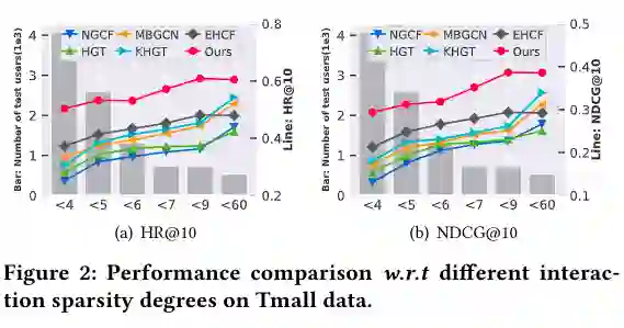 为了说明的 CML 能够一定程度地缓解稀疏性的问题,我们将 user 按照交互数量区间分组(如:“<7” and “<60”)并与其他 baseline 进行比较。结果表明,多行为的模型总是会表现更好,CML在不同程度的稀疏数据下相较于其他模型具有明显的优势。