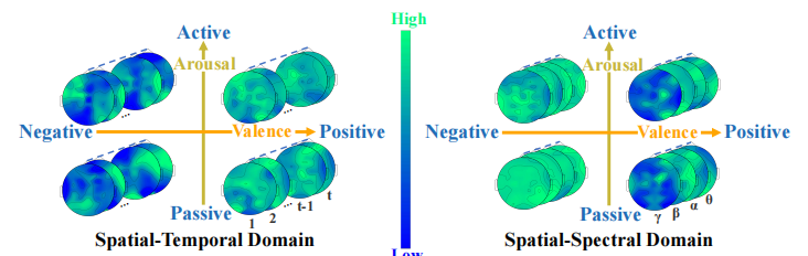 生理信号空间域中的时域信息和频域信息通常具有不同的激活程度。例如,图 1 显示了不同情绪状态下 EEG 信号在空间域中时域和频域特征的差异。例如,在时空域中,时域信息的激活程度直接反映了大脑的活动。高激活度通常与积极情绪有关,低激活度通常与消极情绪有关。在频空域中,𝛾 波段的激活度通常在消极情绪中较高,在积极情绪中较低。