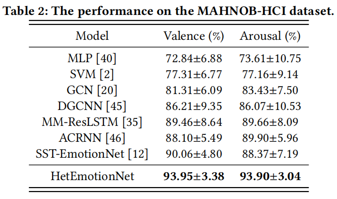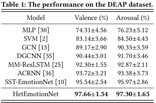 HetEmotionNet 在两个数据集上均取得了优于所有基线方法的性能。我们认为模型分类性能提升的原因有以下几点: