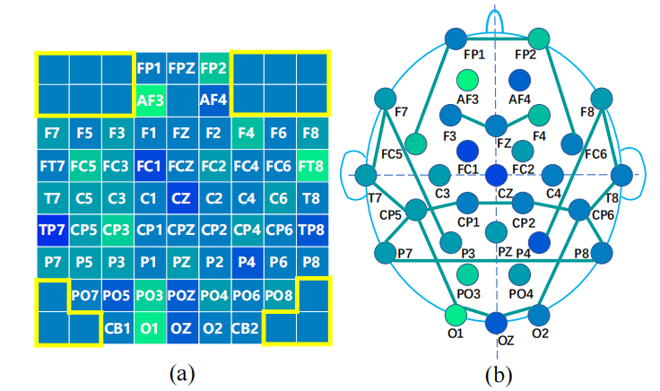 ▲ 图2:两种EEG通道的空间表示。(a):将EEG信号组织成2D map形式。(b):将EEG信号组织成图的形式
